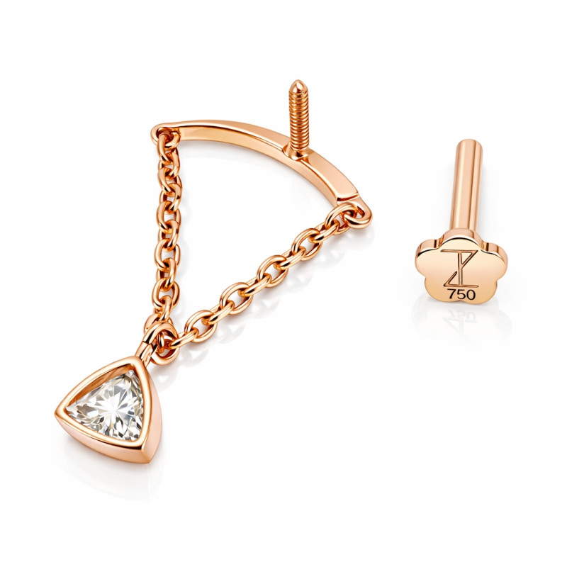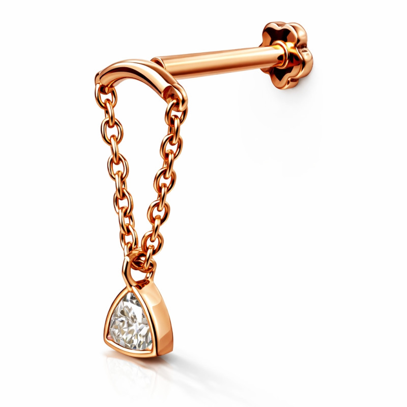 This elegant hidden helix chain stud is crafted in solid 18K rose gold and finished with a 4 mm trillion-cut moissanite, offering sharp brilliance with a modern geometric silhouette. The delicate chain detail allows the stone to hang gracefully beneath the helix, creating a refined yet eye-catching look.