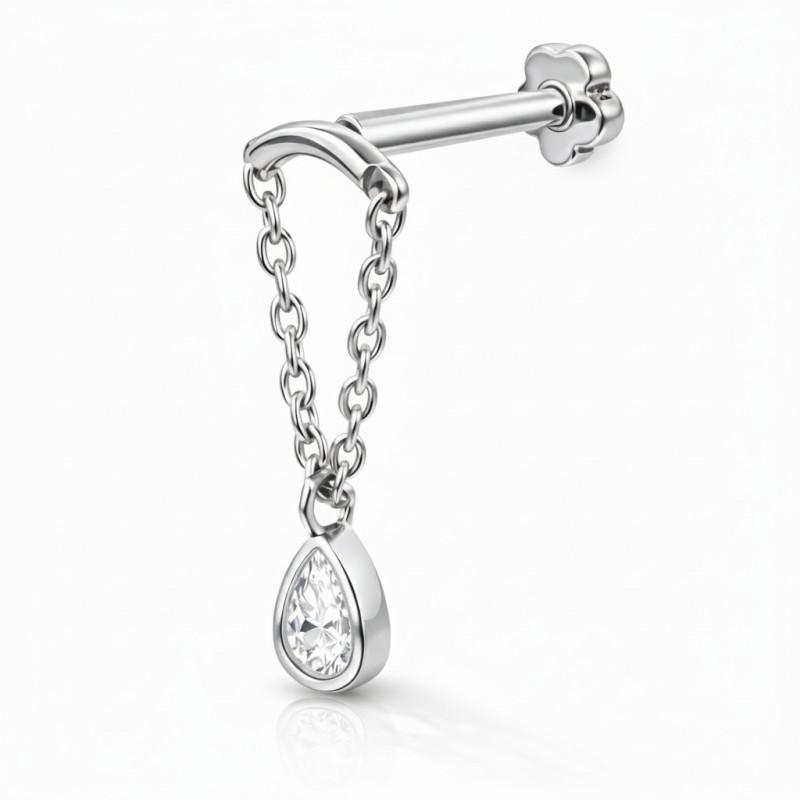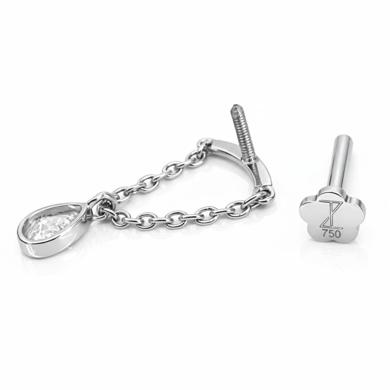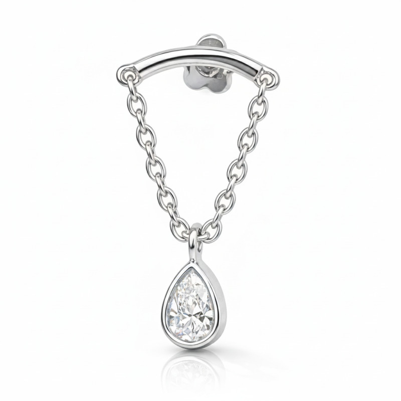 This elegant hidden helix piercing is crafted in solid 18K white gold and features a 4 mm pear-shaped lab-grown diamond, designed to sit beautifully beneath the helix while the delicate chain and stone create a floating, drop-style effect from the back of the ear.
