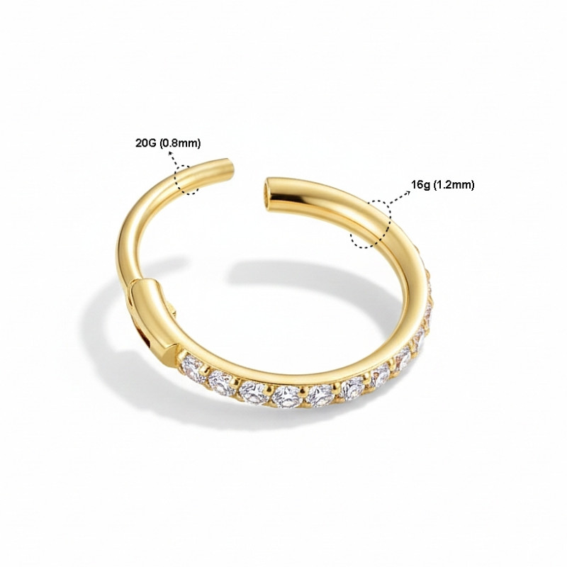 The hoop features a dual-thickness construction—a 16G (1.2mm) outer profile for a bold yet elegant look, and a 20G (0.8mm inner wearing section that passes through the piercing), ensuring enhanced comfort and reduced pressure on healed tissue.