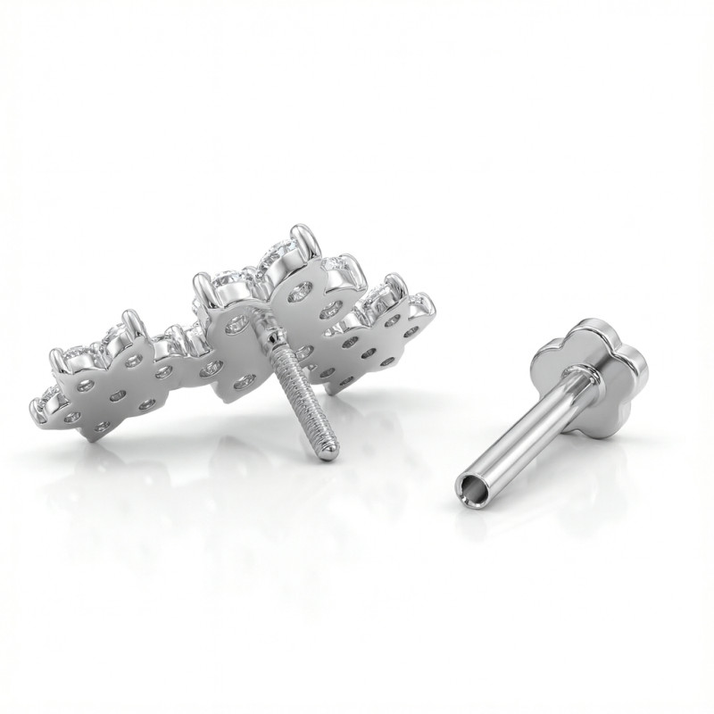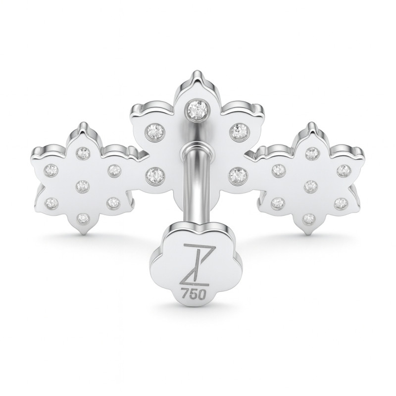 The crisp, bright sheen of white gold enhances the clarity and brilliance of the stones, giving this piece a refined high-jewelry look ideal for curated ear styling. Designed with a flat-back labret and internal threading, it ensures a comfortable, secure, and irritation-free fit — suitable for both fresh and healed piercings.