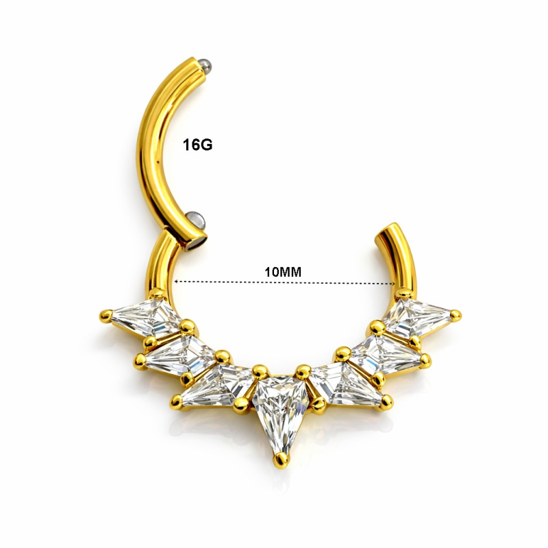 Make a bold and elegant statement with this exquisite marquise fan diamond clicker ring, designed to bring brilliance and sophistication to your piercing collection. Crafted from implant-grade titanium (ASTM F-136) and finished in a radiant luxury gold tone, this stunning piece showcases a beautiful fan arrangement of marquise-cut stones that sparkle with every movement.