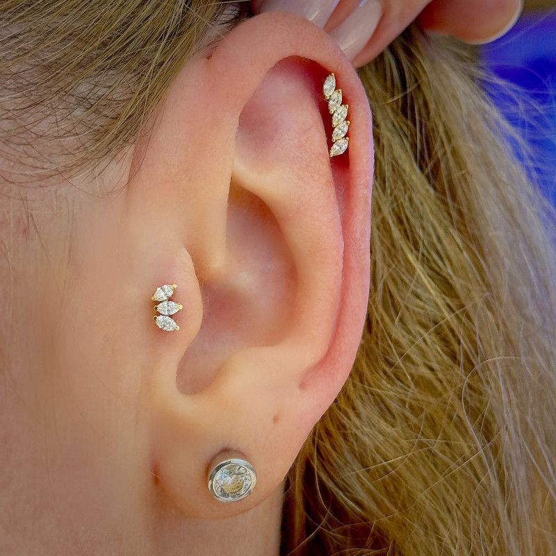 Those seeking a luxurious yet subtle sparkle that sits flush with the ear. Whether it’s your first piercing or an addition to your curated ear stack, this marquise trinity stud complements every aesthetic—delicate, bold, or minimalist.