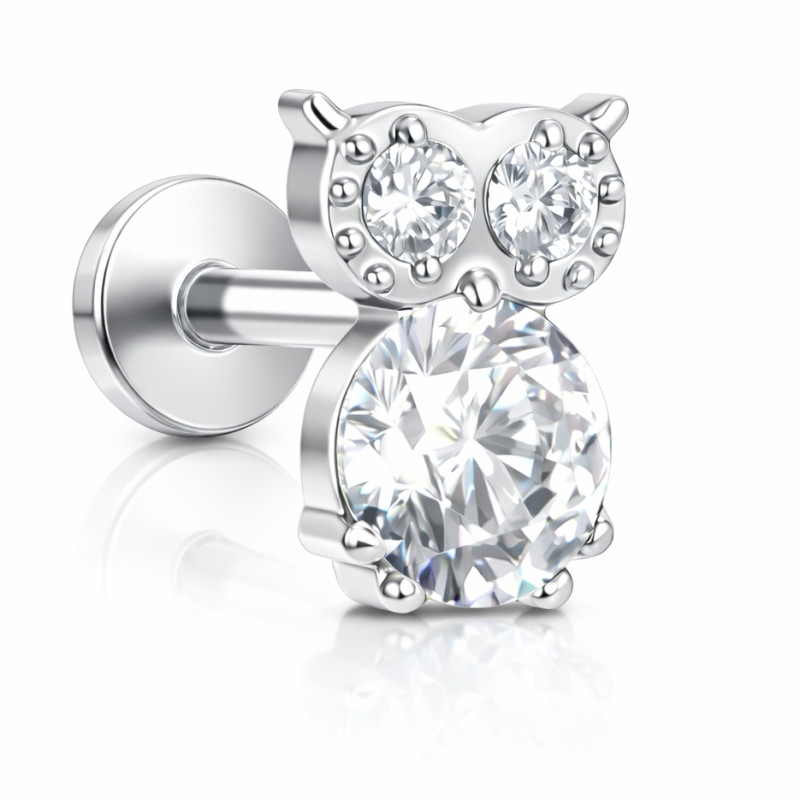 This owl-inspired flat back stud is crafted from ASTM F-136 implant-grade titanium, making it safe, lightweight, and biocompatible for both fresh and fully healed piercings. The playful yet elegant owl design features high-quality cubic zirconia (CZ) stones, offering brilliant shine while remaining gentle on the skin.