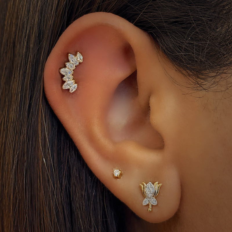 This jewelry is suitable for the following piercings: First Ear Lobe, Second Ear Lobe, Third Ear Lobe, Low Helix, Conch, Flat, Mid Helix, Helix, Upper Helix.