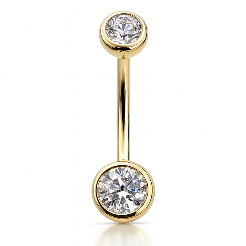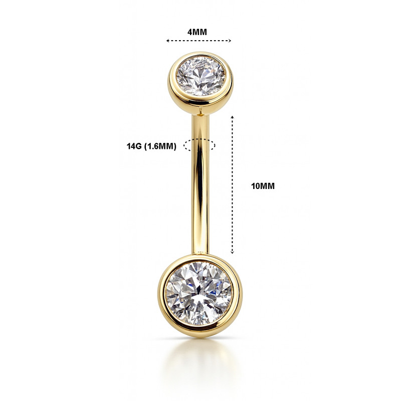 The piece features a 4mm bezel-set cubic zirconia top and a larger bottom cubic zirconia centerpiece, designed to radiate brilliance while maintaining durability. With a 14G (1.6mm) thickness and 10mm length, it provides the ideal anatomical fit for navel piercings.