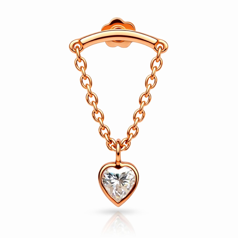 This elegant hidden helix piercing jewelry is crafted in solid 18K rose gold (750) and features a 4 mm heart-shaped moissanite stone, suspended delicately on a fine gold chain. Designed specifically for hidden helix placements, the front-facing heart creates a floating diamond effect from the outer ear while the bar remains discreetly hidden behind the cartilage.