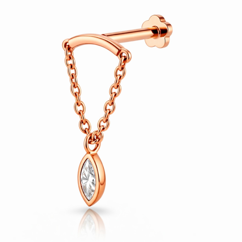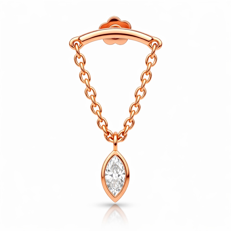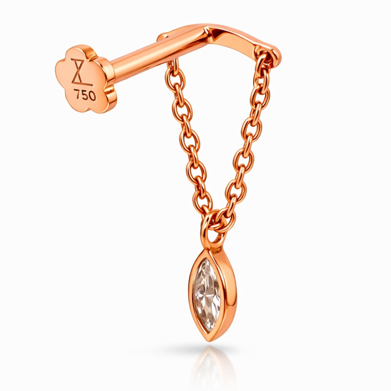 This elegant Hidden Helix Chain Stud is meticulously crafted in solid 18K rose gold, designed to sit discreetly behind the ear while allowing the marquise diamond drop to fall beautifully from the helix. A refined balance of minimalism and luxury, this piece is ideal for both fresh and fully healed hidden helix piercings when sized correctly.
