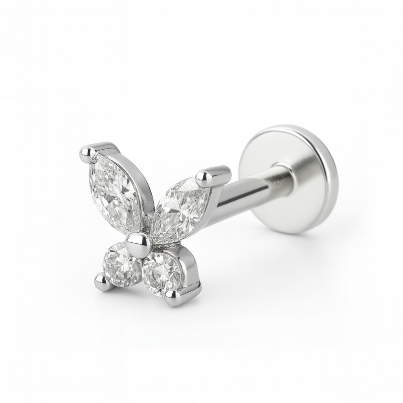 Elevate your piercing collection with the timeless elegance of this butterfly-inspired labret, crafted in luminous 18K white gold. Sparkling with VVS clarity, D color lab-grown diamonds, this piece captures light from every angle — two marquise-cut diamonds forming the graceful wings and two round diamonds completing the delicate design. A true symbol of transformation and luxury.