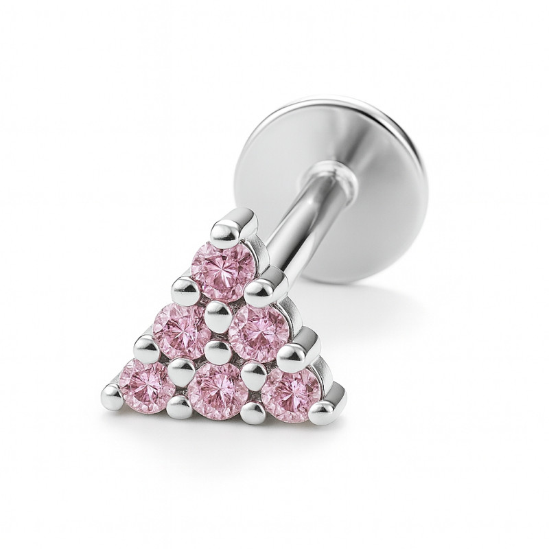Modern, minimal, and beautifully feminine — this geometric triangle stud is crafted from solid 18K White gold and set with nine sparkling light pink cubic zirconia stones. The perfectly arranged round stones create a smooth, symmetrical triangle shape that adds a soft pop of color with a luxurious golden shine.