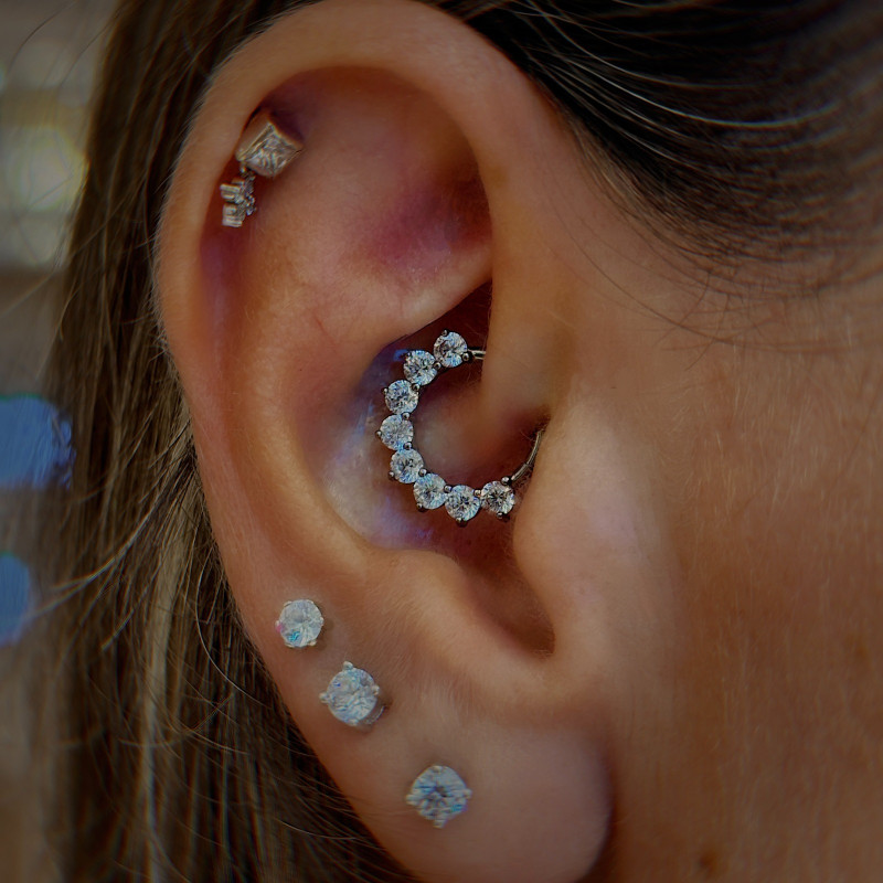 Beautiful ASTM F136 Daith titanium daith and septum piercing hoop studded with charming cubic zirconia for your new piercing as well as everyday use. This is a hinged click lock jewelry; please refer to the product photos for more information on its use.