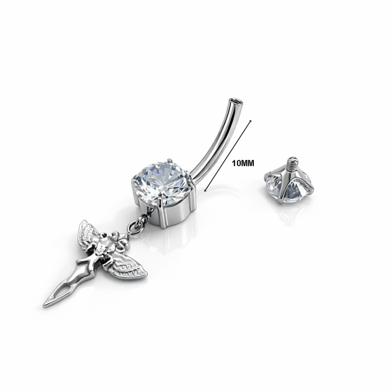 Crafted from implant-grade titanium, this belly bar is lightweight, durable, and biocompatible—making it ideal for sensitive skin and suitable for long-term wear. The sparkling stones enhance its brilliance, while the dangling angel charm adds movement and a graceful aesthetic.