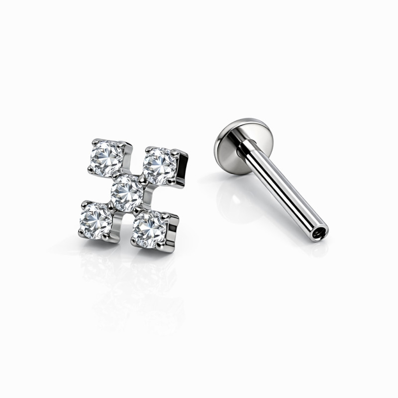 This elegant cross-shaped cluster stud is crafted from implant-grade ASTM F-136 titanium, making it exceptionally safe, lightweight, and suitable for sensitive skin. The design features five brilliant cubic zirconia (CZ) stones, precision-set to create a striking yet balanced cross silhouette with excellent sparkle.