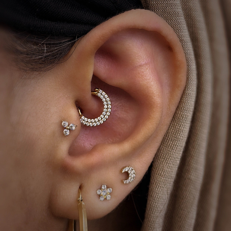 Beautiful ASTM F136 Daith titanium daith and septum piercing hoop studded with charming cubic zirconia for your new piercing as well as everyday use. This is a hinged click lock jewelry; please refer to the product photos for more information on its use.