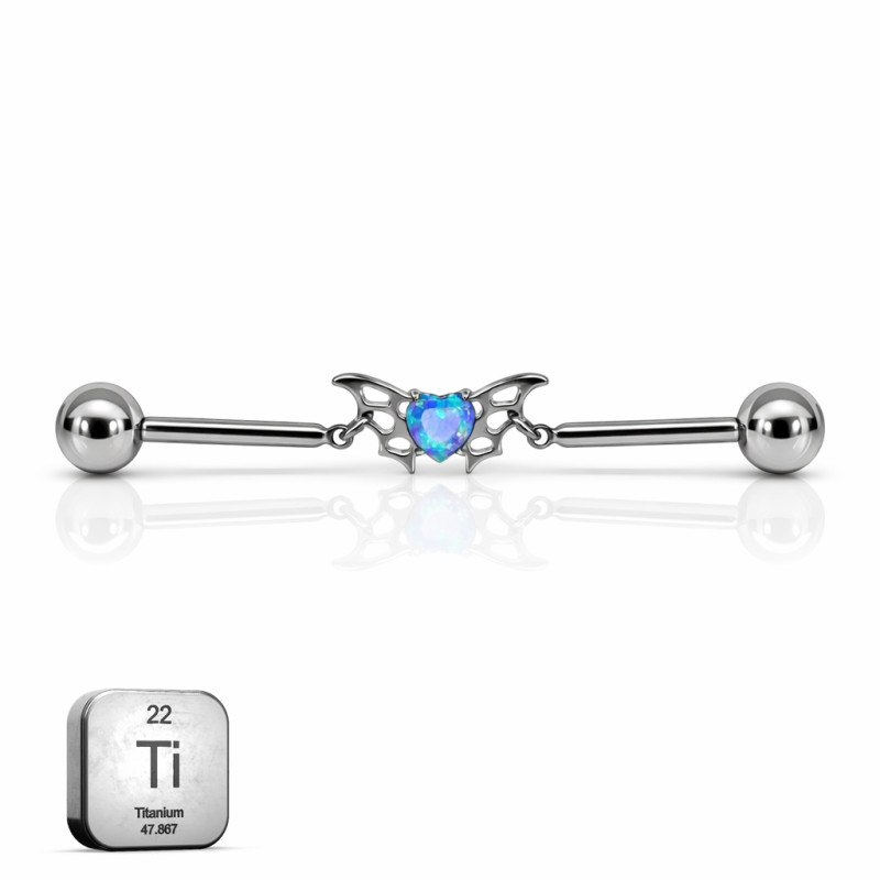 This industrial barbell is crafted from implant-grade titanium, designed for strength, comfort, and long-term wear. The centerpiece features a bat-wing motif with a heart-shaped synthetic opal, adding a bold yet elegant statement to a classic industrial piercing.