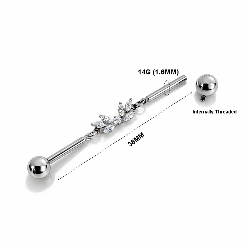 A sleek and elegant industrial piercing barbell, crafted in implant-grade titanium for maximum comfort, durability, and skin safety. The design features a delicate leaf motif centerpiece set with high-sparkle stones, adding a refined touch to a bold industrial look.