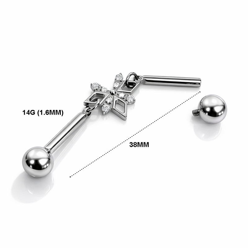 A striking industrial piercing barbell featuring a delicate star-inspired centerpiece, designed to elevate classic industrial piercings with a refined sparkle.