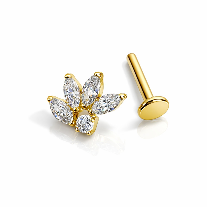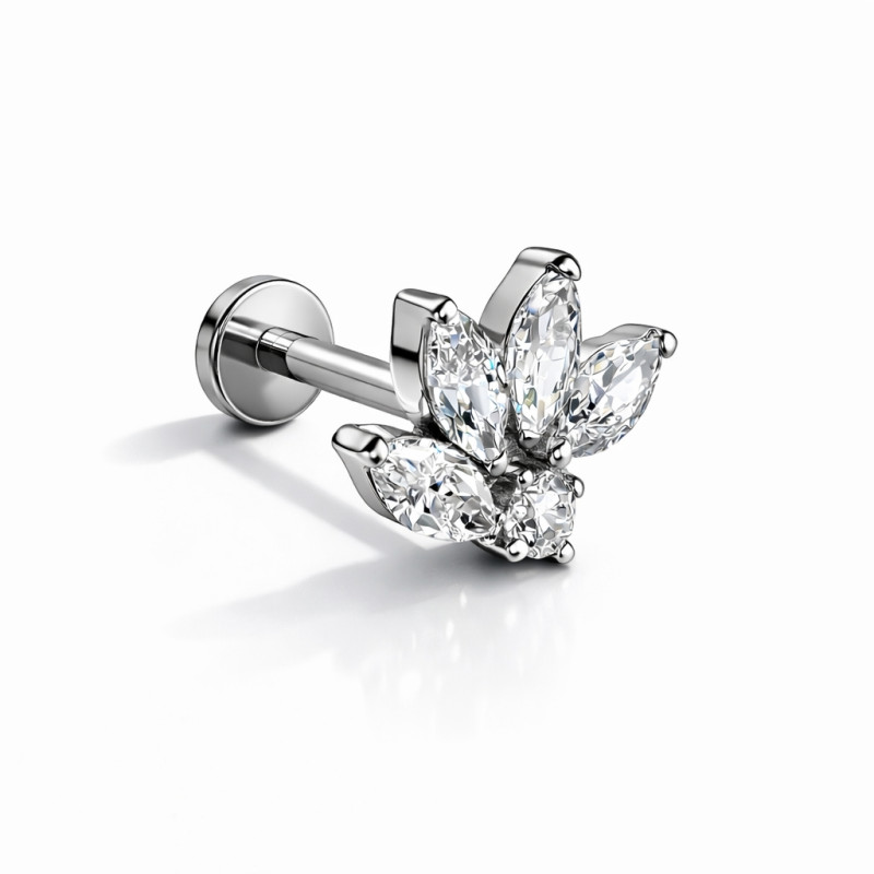Add refined elegance to your piercing with this marquise cluster flat back stud, crafted from implant-grade titanium and finished to the highest professional piercing standards. Featuring a leaf-inspired cluster of sparkling cubic zirconia stones, this piece offers a perfect balance of luxury aesthetics and medical-grade safety.