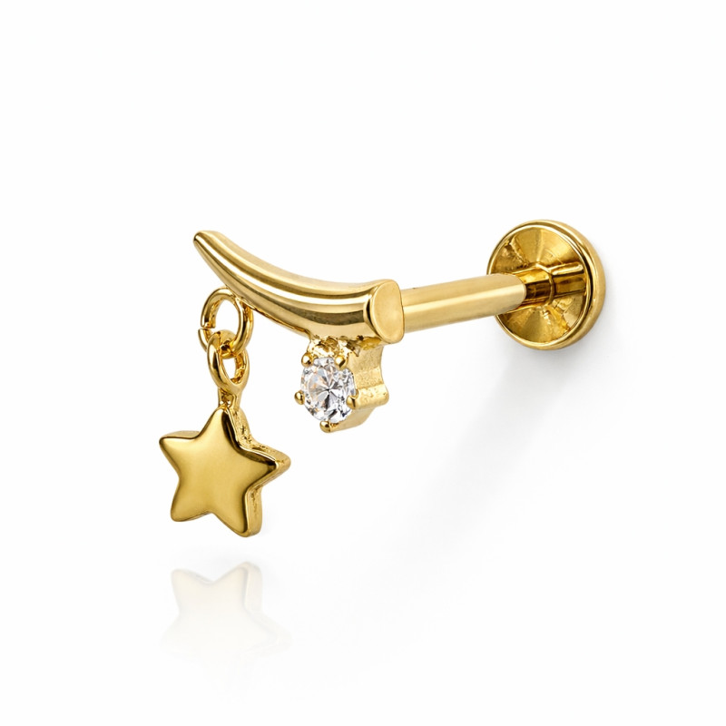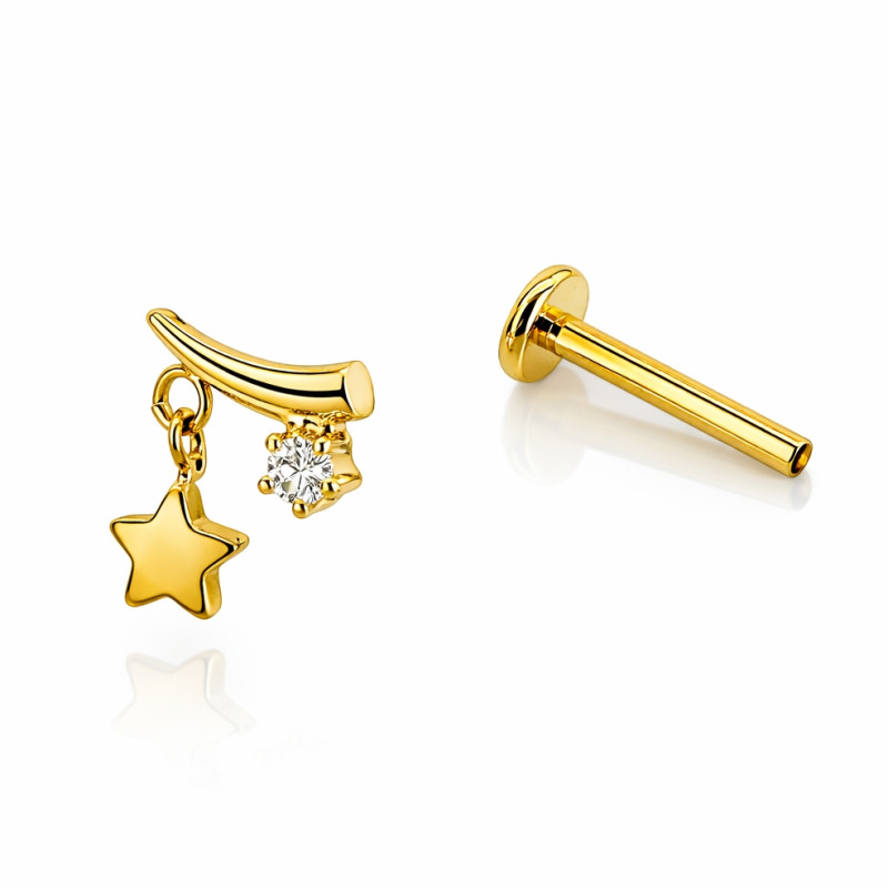 This elegant internally threaded flat-back labret features a curved top with a sparkling clear stone and a delicate dangling star charm, offering movement and shine while maintaining everyday comfort.
