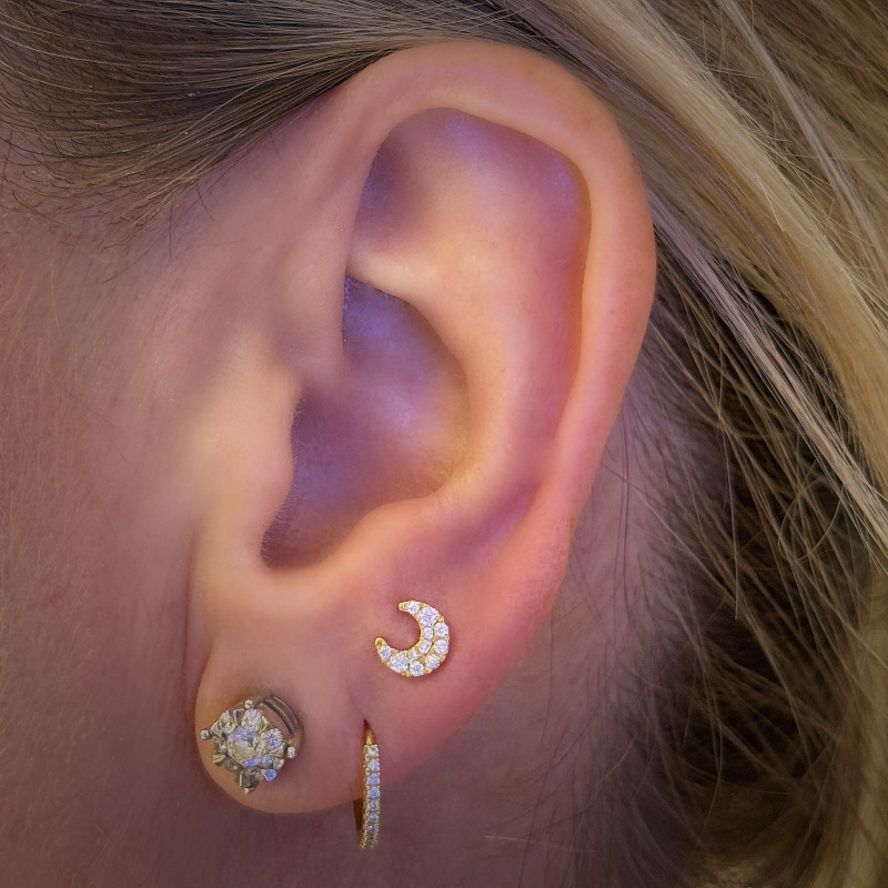 Perfect for earlobe, helix, tragus, and cartilage piercings, this delicate moon design offers a timeless sparkle that elevates any piercing style.